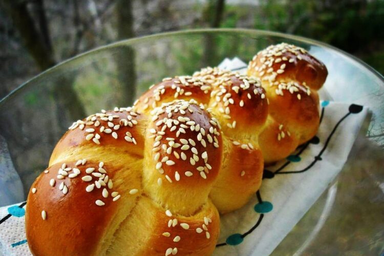Замесете тесто од сите сотојки и оставете да стаса околу 90 минути. Поделете го на 12 еднакви делови , и секој дел поделете го на половина. Направете две долгнавести ленти и ставете ги една врз друга во форма на крст. Повлечете ги краевите хоризонтално во обратен правец се додека не се формира убава плетенка. Оставете ги да стасаат околу 45 минути и премачкајте ги со изматена жолчка и 2 лажици млеко. Одозгора нарусете сусам. Печете на загреана рерна околу 25 минути или додека не поруменат убаво.
