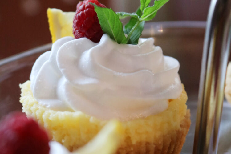 Во сад на страна изматете цврста шлаг пена од млекото, кесичките за шлаг и ванилата. Изматениот шлаг префрлете го во готварски шприц и нанесете на секое парче од чизкејк мафините. Декорирајте со малина и гранче свежо нане.