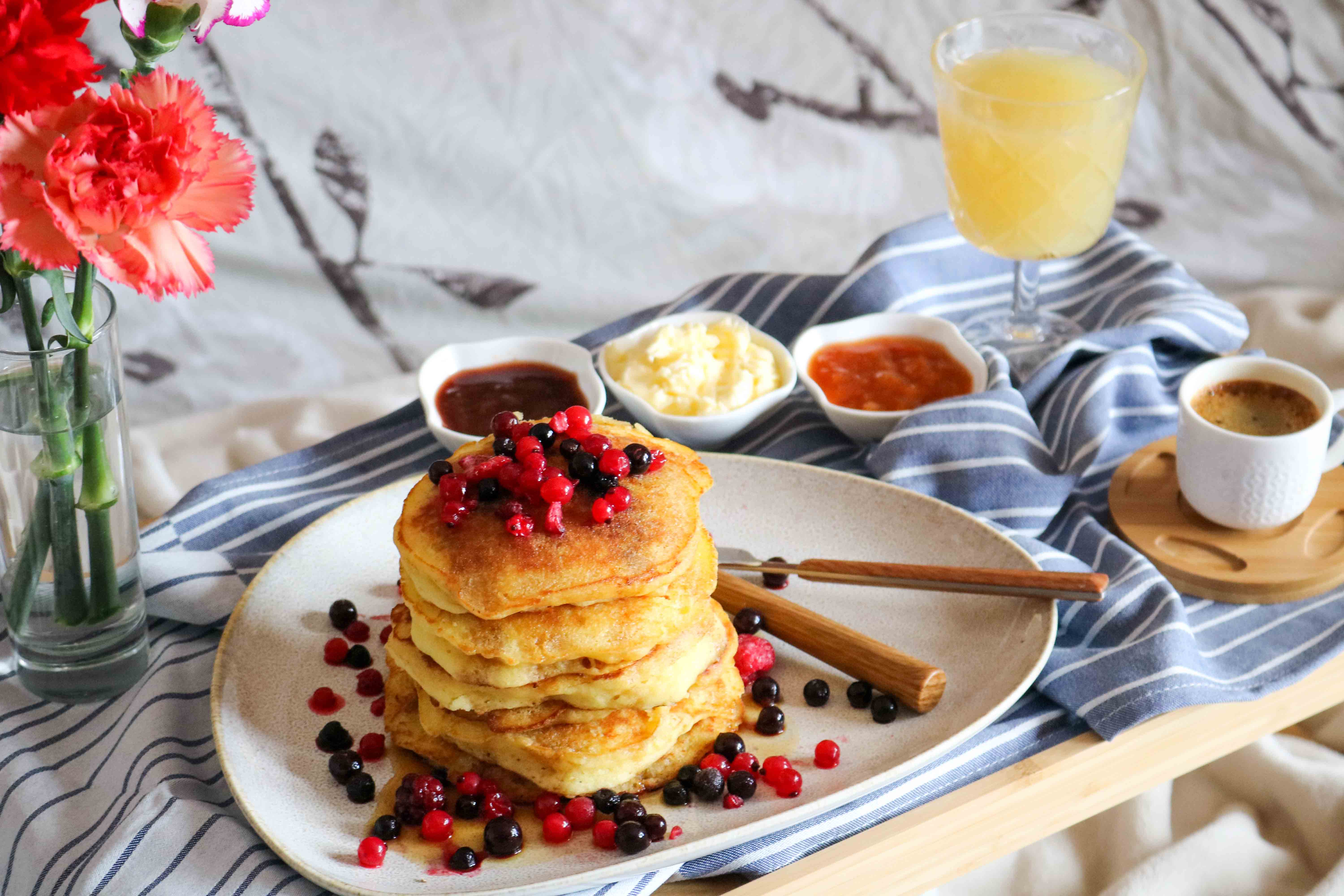 Со ваков појадок неизбежно е да се послужи и шолја кафе и свежо исцеден сок од ананас или портокал. Бидејќи секогаш внимавам на деталите, украсете ја дрвената даска со свежо цвеќе. Никогаш не заборавајте дека малите нешта се оние кои го прават животот убав.