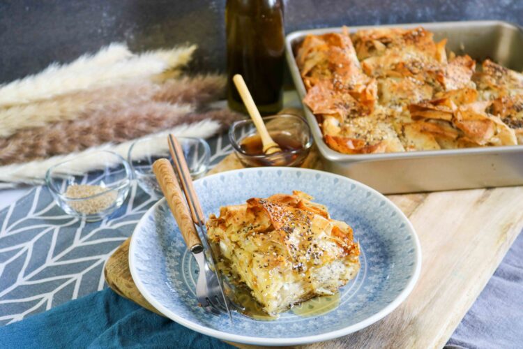 Наполнета е со фил од несолена урда и рендан пармезан, но она што ја прави уште повпечатлива и егзотична е нејзината презентација. Секое парче од оваа пита го сервирам со со мед. Иако за повеќето од вас ова ќе звучи помалку необично, но ви ветувам дека еднаш кога ќе ја вкусите комбинацијата сигурно ќе ја засакате.