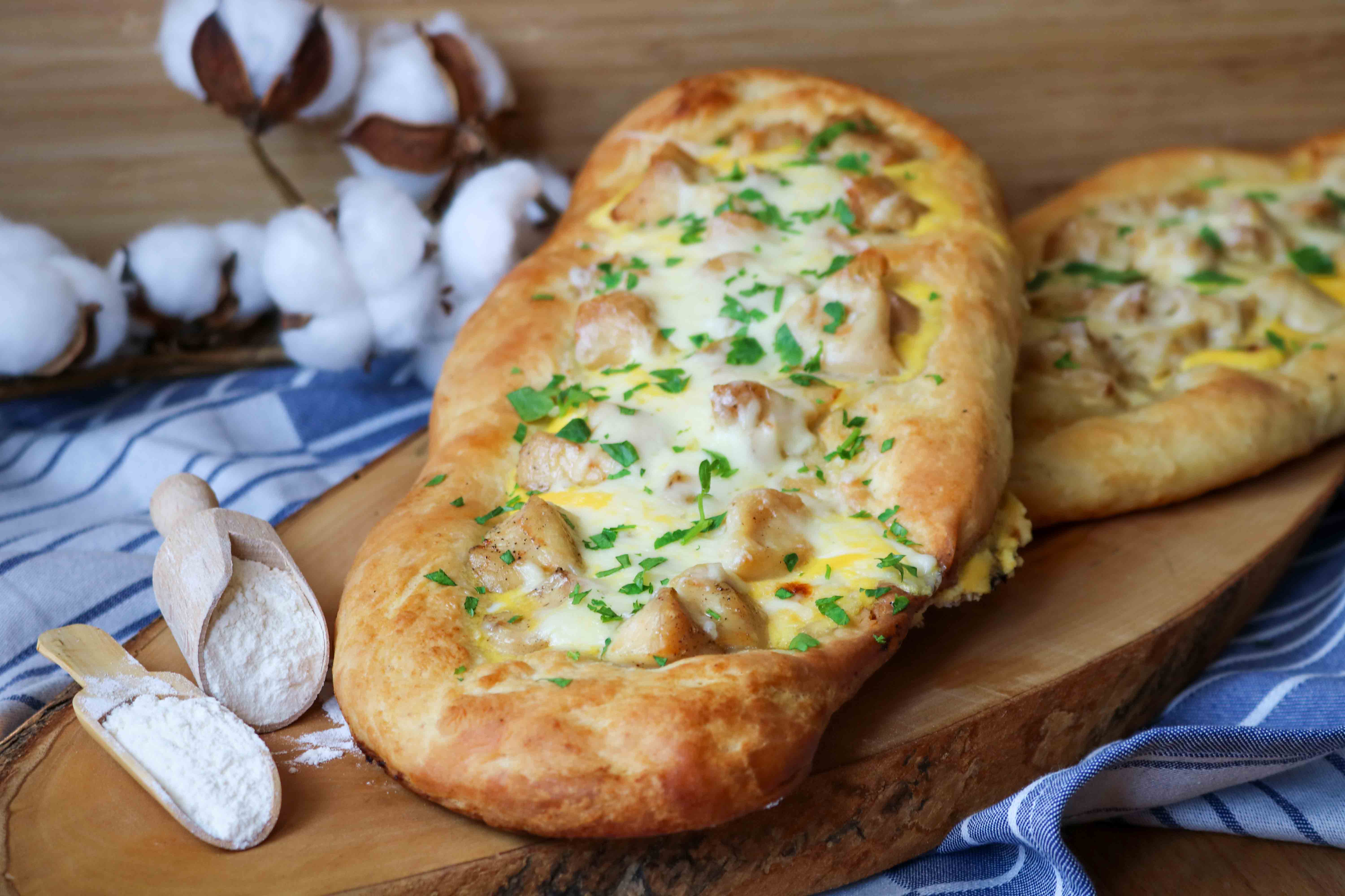 Поделетего тестото на 4 еднакви делови (доколку сакате помали пастрмалии поделете го ина повеќе делови). Секој дел растегнете го со раце во форма на чамец,формирајќи подебел крај на рабовите.