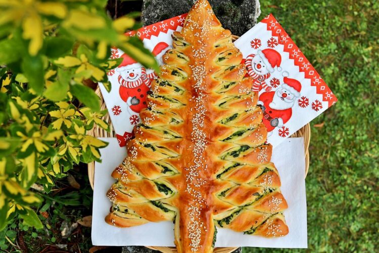 Декоративна елка погача со фил од спанаќ и сирење